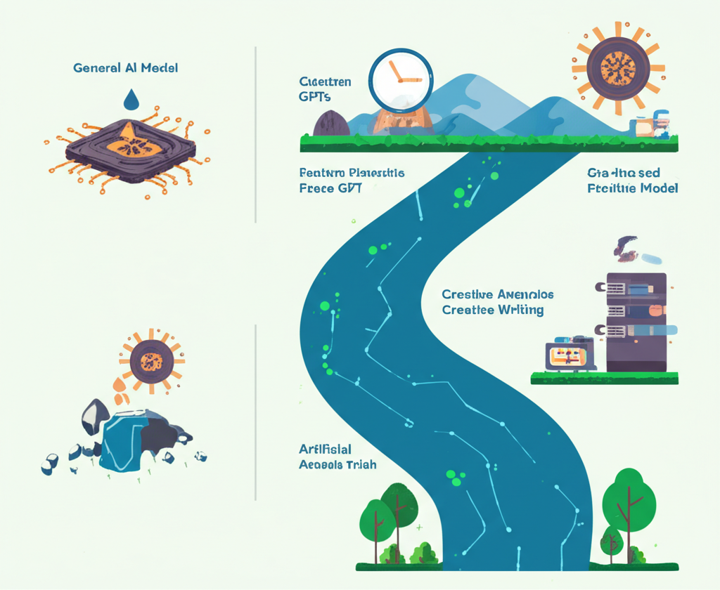 An illustration of the transition from general AI models to custom GPTs focusing on specific tasks and applications